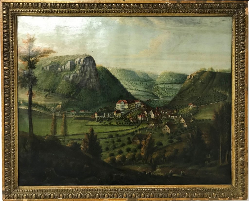 Der unbekannte Maler, der über 50 Jahre später zum Pinsel griff, hielt den Zustand fest, der sich aus dem Abriss der Reste von Burg Hoheneybach und dem Schlossneubau ergab: im Innern des Eybtals und direkt unter dem Himmelsfelsen liegt das Degenfeldsche Schloss, durch eine niedrige Mauer vom Dorf Eybach getrennt. In Eybach selbst erkennt man die von Protestanten und Katholiken gleichzeitig genutzte Kirche Mariä Himmelfahrt, um die sich die landwirtschaftlich geprägten anderen Gebäude Eybachs scharen. Dem Dorf gegenüber und vor dem Schloss liegen eine ausgedehnte Parkanlage und herrschaftliche Gärten mit zahlreichen Nebengebäuden, einem Pavillon und dem sogenannten „Schlössle“, das erst 1976 dem Ausbau der Straße weichen musste. Im Hintergrund verschwindet in malerischem Grün die Landstraße ins Roggental Richtung Roggenmühle. Verschiedenste Grüntöne dominieren das Bild und betten Eybach in die umgebende Landschaft ein – eine Ansicht die sich in der Realität trotz ausgedehnter Bebauung auch heute noch immer ergibt.