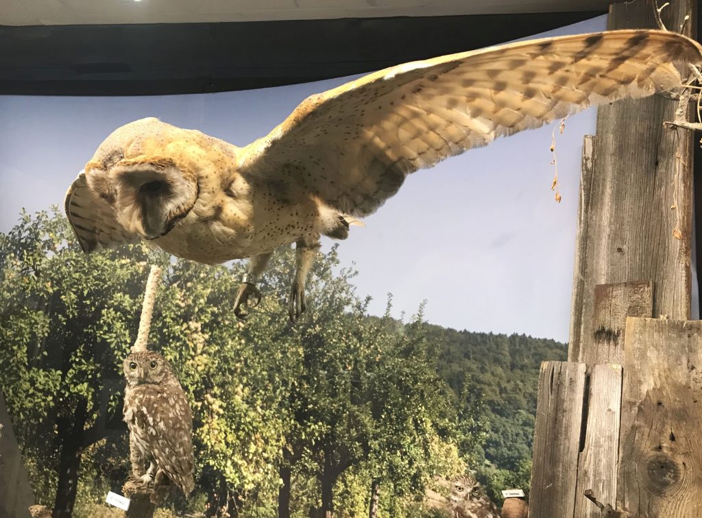 Trotz dieses Aberglaubens ist es bedauerlich, dass die Schleiereule in der Vogelwelt keine Laute mehr von sich geben kann. Wie alle Exponate aus der Ausstellung wurde auch sie selbstverständlich nicht für Sammlungszwecke getötet, sondern dem Ornithologen Dieter Rockenbauch als Totfund übergeben. Einem Präparator gelang die Darstellung des erwachsenen Männchens in sehr natürlicher und schon fast lebendiger Form. Der Vogel gehört dabei zu jenen Präparaten, die in der Vogelwelt scheinbar tatsächlich aus den Vitrinen heraus zum Leben zu erwachen – im Fall der Schleiereule natürlich nur nachts…